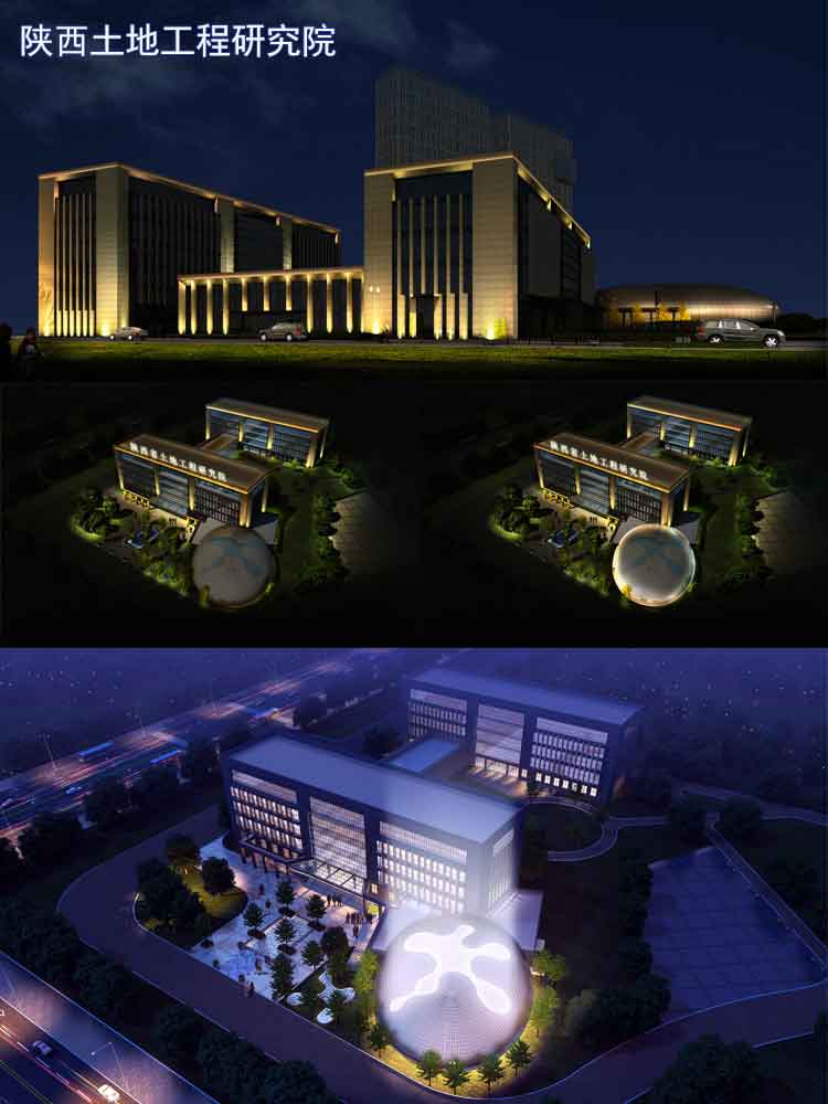 陜西土地工程研究院是承擔(dān)各類建設(shè)工程勘察、設(shè)計(jì)、土建、安裝、市政、石化、公路、地鐵、機(jī)場(chǎng)、礦山、核電、裝飾、鋼結(jié)構(gòu)、古建園林工程施工。對(duì)于設(shè)計(jì)院辦公樓體亮化設(shè)計(jì),公司設(shè)計(jì)師跟根其前后樓體的建筑和廣場(chǎng)的球狀建筑的特點(diǎn),采用簡(jiǎn)單的洗墻燈和投光燈來(lái)進(jìn)行效果設(shè)計(jì),彰顯建筑的大氣與威嚴(yán)。