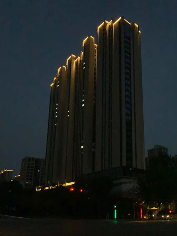 簡(jiǎn)介—— 蔚來(lái)熙語(yǔ)項(xiàng)目位于航天城航天中路與神舟二路十字東南角,項(xiàng)目占地15畝,由2棟公寓及其商業(yè)生活配套組成,Art deco的建筑風(fēng)格。我司承擔(dān)外立面亮化工程,對(duì)樓體頂部打亮及樓體線條的勾勒,做輪廓亮化,突出整體建筑,美化樓體。
